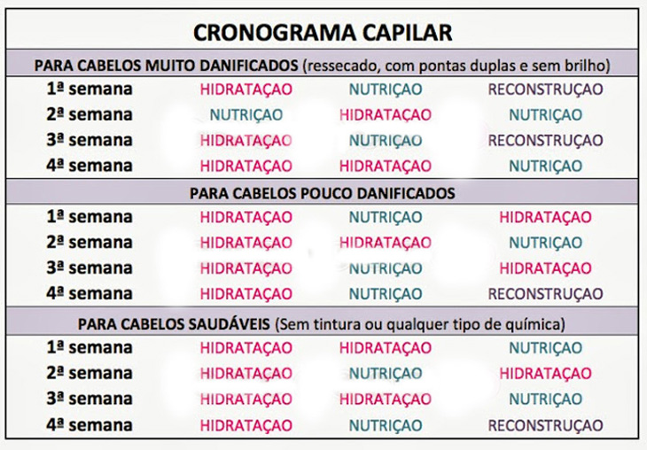 Segue em baixo uma imagem com os tipos de cronograma capilar que podem ser feitos: